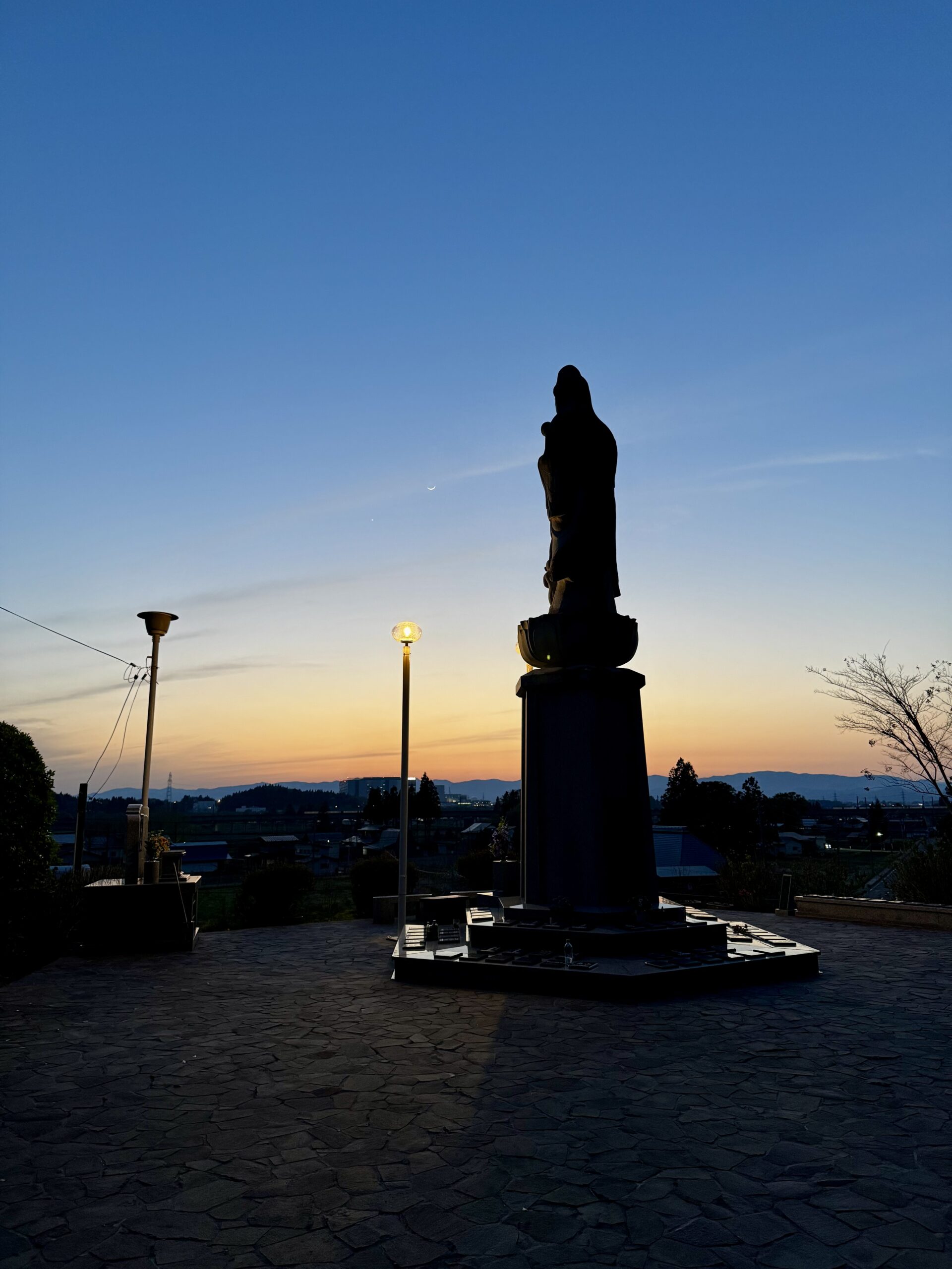 お祭りのすべてを終えた時、観音様の背後から美しい夕焼けと新月と明星を観ることができました。